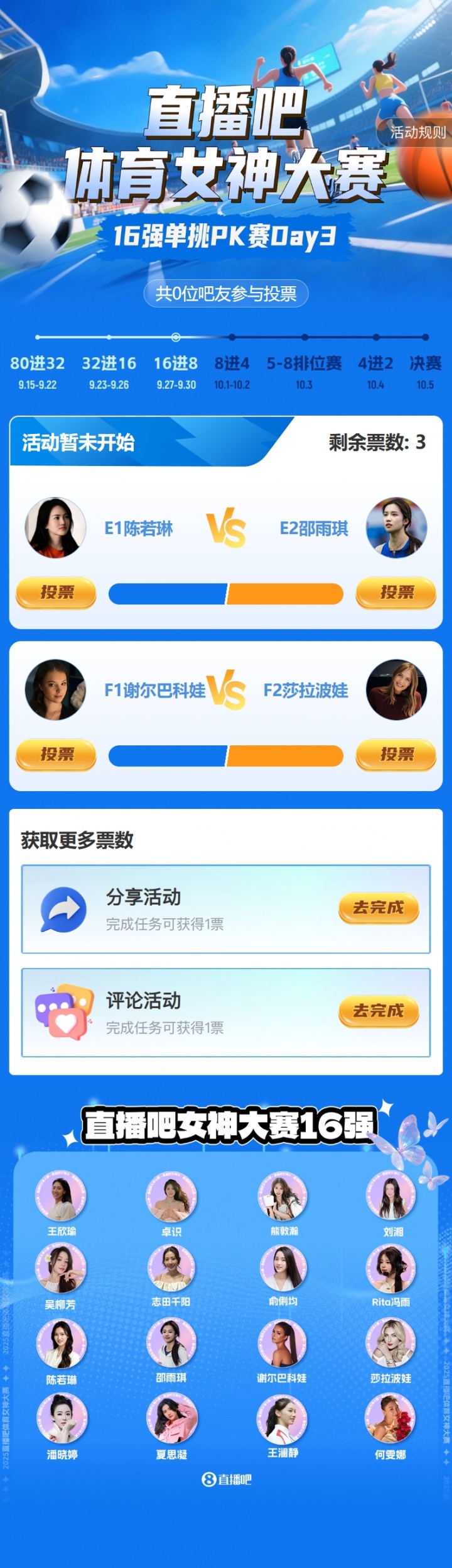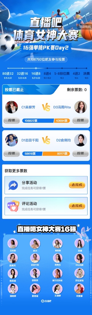 2025年『体育女神大赛』昨日结束了16强单挑PK赛Day2的争夺,Day2结果如下: